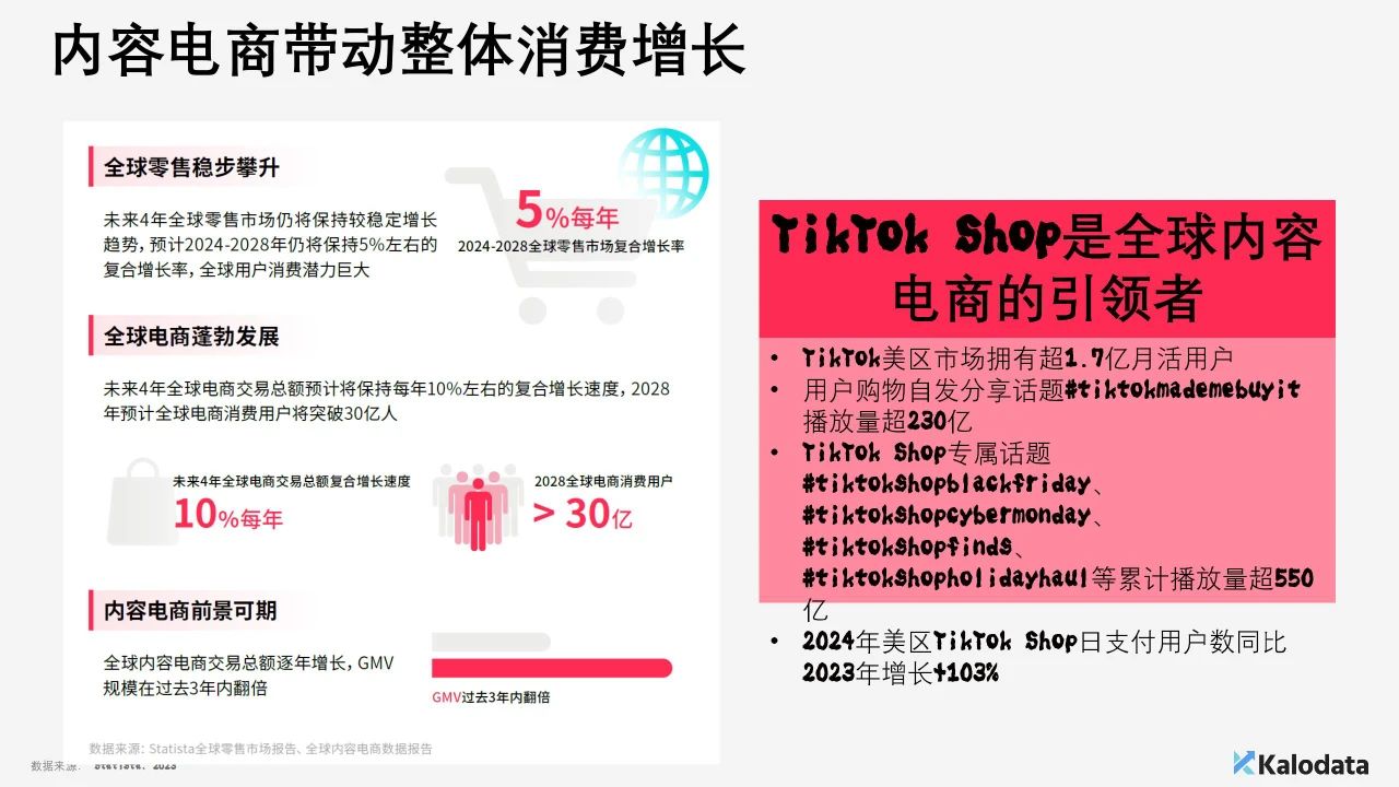 他还提到,全球零售市场在未来四年内将保持稳定增长趋势。预计2024年至2028年,全球零售市场的复合增长率将维持在5%左右,显示出全球用户消费潜力的巨大空间。此外,全球电商交易总额在未来四年内预计将以每年10%左右的复合增长率持续增长。到2028年,全球电商消费用户数量预计将突破30亿人,标志着全球电商行业的蓬勃发展。其中,全球内容电商交易总额逐年增长,GMV规模在过去3年内翻倍,前景可期。
