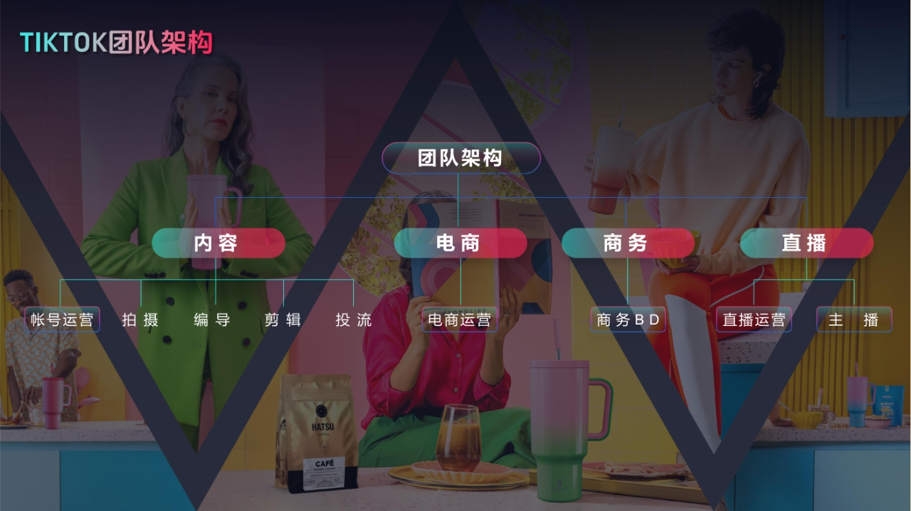 郑浩勇介绍,目前其TikTok团队的架构主要分为4个板块:一是内容板块,下设账号运营、拍摄、编导、剪辑、投流;二是电商板块,下设电商运营;三是商务板块,下设商务BD;四是直播板块,下设直播运营和主播。这个团队架构可供潮青和跨境电商参考。