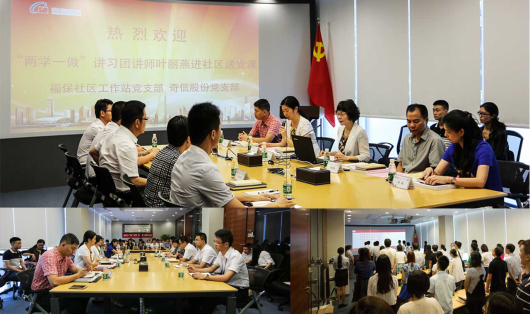 为深入学习贯彻“两学一做”学习教育活动要求,切实提高广大党员的党性修养、政治思想素质,2016年6月22日,深圳市“两学一做讲习团”讲师、中共深圳市地方税务局机关党委副书记叶丽燕女士及福保社区党委书记简国龙,第一书记毕杰,党委副书记何战、刘小敏一行莅临奇信股份党支部开展专题党课教育,奇信股份党支部及福保社区工作站党支部党员参加了此次活动。