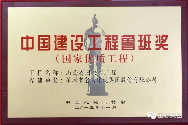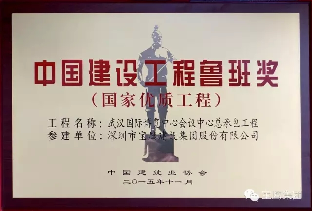 11月17日,2014~2015年度中国建设工程鲁班奖(国家优质工程)表彰大会于北京盛大举行,大会向获奖单位颁发了获奖证书、奖牌及鲁班金像。宝鹰集团参建的武汉国际博览中心会议中心工程和山西图书馆工程获得了中国建设工程鲁班奖。