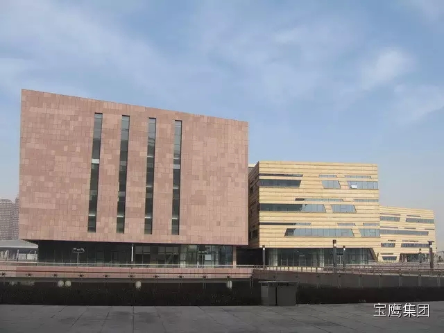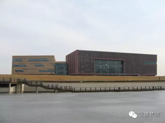山西省图书馆位于太原市长风商务区文化岛,型钢混凝土框架结构,外形呈不规则L形布局,造型优美,形似书山,室内空间立体感强。建筑风格舒适宁静、简约大方,并彰显了山西院落建筑文化与现代建筑理念的完美结合。鲁班奖评审组专家评价该工程,作为全智能化场所、民生工程、省标志性建筑,达到了一流建造水平。工程造型新颖独特,结构复杂,创优方案好,施工管理规范,质量精良,外观精细,功能完备。使用了建筑业十项新技术,部分关键技术应用达到国内领先水平。宝鹰集团承建了山西图书馆全部外墙装修工程,该工程主要以石材幕墙为主,是华北地区最节能、最环保、设计最独特的场馆类幕墙工程之一。日本著名建筑杂志《 JA 》曾对该工程做过专 题报道。