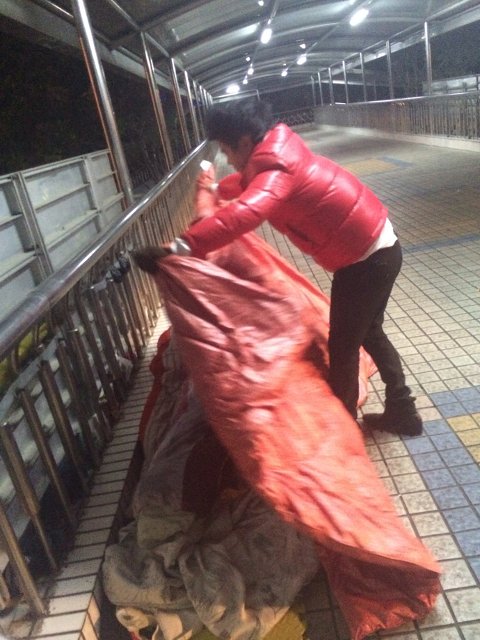 志愿者为流浪者送上御寒棉被