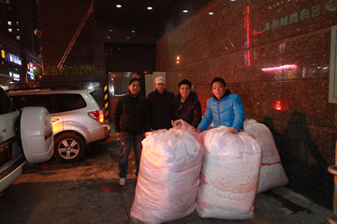 “潮高高尔夫联盟”志愿者在搬运棉被