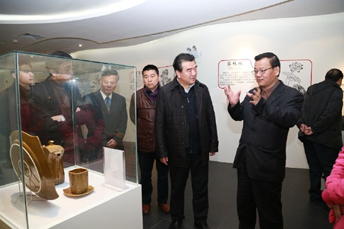 长城集团董事长蔡廷祥(右1)向中央人民广播电台台长王求(右2)、潮州广播电视台台长伍茸(右3)介绍长城瓷艺。