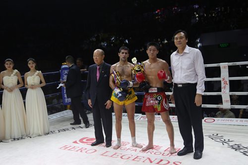 第十场是今晚最受关注的中日搏击大战,作为英雄传说72kg世界金腰带争夺战,来自盛华的名将徐琰迎战日本K-1冠军佐藤嘉洋,结果两人打满精彩的三个回合,三名裁判的打分却是惊人的相同,均为30-30,因此,组委会判定本场比赛结果为平局。徐琰在今年初山东济南站收获的70公斤级金腰带继续保留。