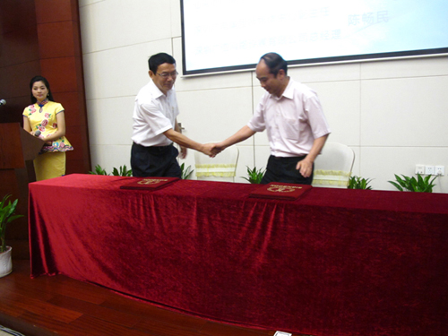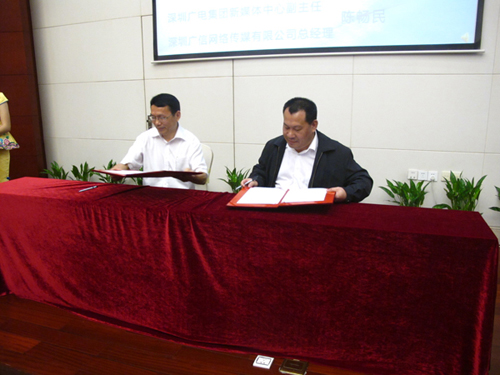 汕头市广播电视台台长杜绍茂(右)与深圳广电集团新媒体中心副主任、深圳广信网路传媒有限公司总经理陈畅明(左)在现场签约。