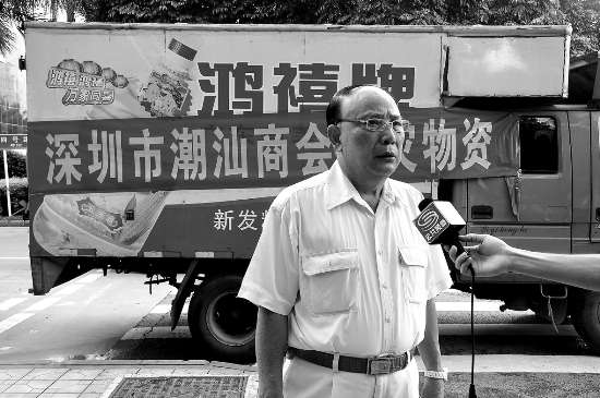 救灾呼吁一经发出,四面八方潮商纷纷响应,出钱出力,义无反顾,有的会员还亲自来到商会了解救灾情况。一个个认捐电话打进来,一批批物资连夜采购装车。20日早上7点,深圳市潮汕商会会所楼下,两辆运送物资的大货车已经就位。车身上悬挂着“深圳市潮汕商会赈灾物资”的红底黄字标语分外醒目。