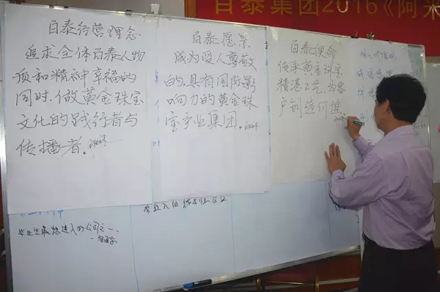 本次研讨会构建了百泰集团的经营哲学原点,梳理归纳出企业的经营理念、使命、愿景与核心价值观,为公司未来发展指明了方向。百泰集团经营理念追求全体百泰人物质和精神幸福的同时,做黄金珠宝文化的践行者与传播者;百泰集团企业愿景成为受人尊敬的、具有国际影响力的黄金珠宝产业集团;百泰集团企业使命传承黄金珠宝精湛工艺,为客户创造价值;百泰集团核心价值观诚信感恩、拼搏创新、利他共赢 。