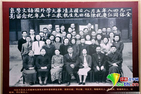 冯友兰纪念馆展出的冯友兰(前排右二)与清华大学外语系师生合影。图片来源:冯友兰纪念馆网站