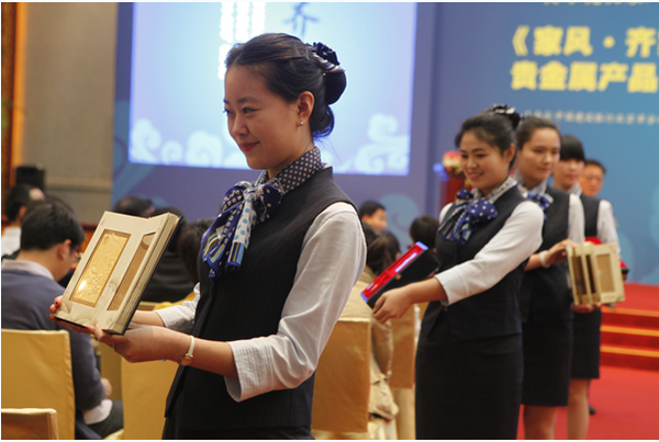 4月17日,"家风·齐家三宝"首发签售仪式在北京钓鱼台国宾馆隆重举行,中国建设银行[-1.43% 资金 研报]与深圳市百泰国礼投资有限公司继《家风·弟子规》后再度携手合作,倾力打造包括《百善孝为先》、《金榜题名卡》、《福在眼前平安扣》在内的"家风·齐家三宝"典藏臻品,续写《家风》系列新篇章,也在大力弘扬和践行社会主义核心价值观的当下,为传承数千年的家风文化增添了新的内涵。