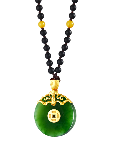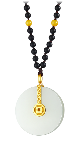 《福在眼前平安扣》则是一件金镶玉作品,以蝙蝠、金钱为元素,"蝠"通"福","钱"通"前",寓意"福在眼前,福佑安康";玉取昆仑和田玉,有温润定心之效,护佑平安,是福瑞、安宁的象征,包含了人们对美好生活的追求和向往。