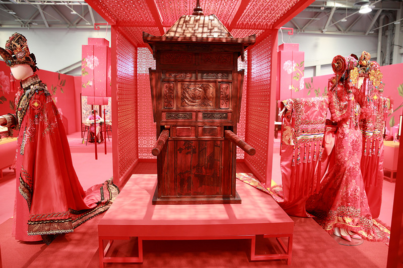 “锦绣长红”馆被大红色的喜庆气氛包围,走进馆内,踩上红毯,宛如参加一场梦幻的中式婚礼。馆内点缀着各种刺绣作品:牡丹刺绣灯笼、中式新娘嫁衣、双面刺绣屏风……件件美不胜收。此次展览的刺绣全部来自“苏州刺绣研究所”,充分展现苏绣之美和其高超技艺。展览期间,除了众多的国宝级藏品展示之外,还有高级工艺美术大师现场示范精湛的刺绣艺术工艺,令人大开眼界。