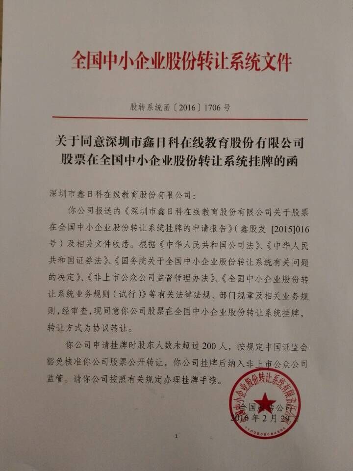 2016年2月29日,专注于为企业及社群提供移动学习解决方案及运营服务的鑫日科(股转代码:836672)正式于新三板挂牌。