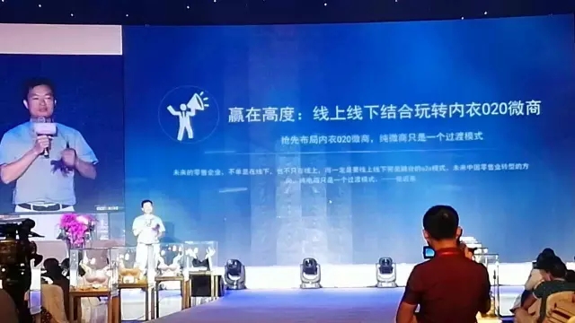刘伟斌老师在会上做了专题演讲《星星之火 可以燎原》,纵论内衣微商未来。他认为内衣微商“才刚刚开始”,“真正的内衣微商主力还在观望”,“内衣微商新品牌完全可以弯道超车、再创辉煌”,深入剖析内衣品牌微商后起品牌的机会和空间。他认为:内衣微商的下一个形态,一定是内衣O2O微商。内衣O2O微商一定是内衣实体店逆袭的绝好机会!