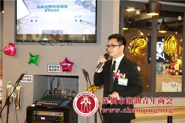 深圳汕头大学校友商会执委、深圳市潮汕青年商会副会长林泽练致欢迎词辞,并做2015工作汇报及2016工作展望。作为深圳市汕头大学校友商会执行会长、筹委会执行委员,林泽练先生以团结协作、共谋发展、报效母校、奉献社会为宗旨,通过筹办深圳市汕头大学校友商会,搭建了一个汕大校友名企沟通政府、报效母校、内外交流、互动合作、共寻发展商机的综合商务服务平台。他表示2015年商会取得了显著的成绩,规模不断扩大,与汕大的互动不断加强,商会成员资源共享互助共赢、三大平台服务不断完善,国际交流合作日渐频繁。展望2016年的工作,他表示今年将集中在与母校的互动以及孵化、融资、国际合作三大平台的建设,势必将商会提升至一个新的高度。