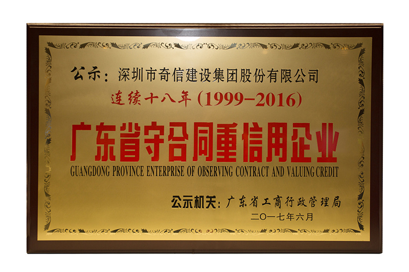 日前,广东省工商行政管理局向社会公众公示了2015-2016年度“守合同重信用”公司名单,深圳市奇信建设集团股份有限公司(以下简称:奇信股份,股票代码:002781)再次获得此殊荣,连续18年蝉联“广东省守合同重信用企业”。