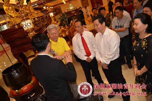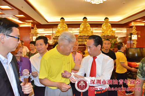 6月18日上午,两会考察团前往本会名誉会长、深圳市普宁商会常务副会长、盛凡集团董事长吴银文企业参观。位于平湖凤凰城大型高端佛教文化艺术品展馆——圣冠文化艺术品展览馆金碧辉煌,佛音环绕,集团研发生产的各式鎏金佛像佛具错落有致摆放,形态各异,让人仿佛置身于佛陀世界,忘情于佛教文化的艺术之海。