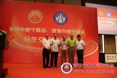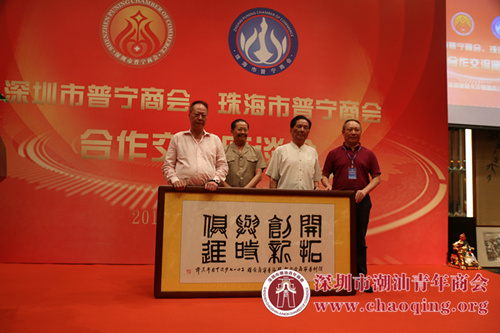 珠海市普宁商会纪少雄会长(左二)、吴齐名誉会长(右二)和苏攒淘执行会长(右一)向黄楚龙会长(左一)赠送礼物