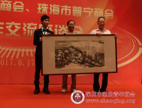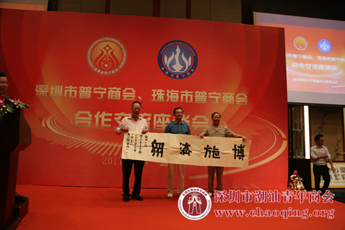 珠海市普宁商会纪少雄会长(中)和江飞鸿名誉会长(左)向黄楚龙会长(右)赠送礼物