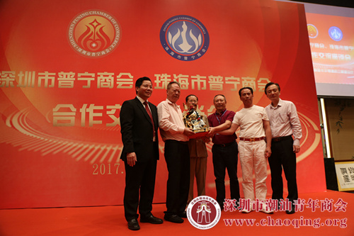 黄楚龙会长(左二)、周南执行会长(左一)、吴银文常务副会长(右二)和黄坚泰秘书长(右一)向珠海市普宁商会纪少雄会长(左三)以及苏攒淘执行会长(右三)赠送礼物