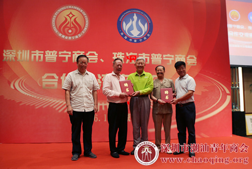 李统书主席(中)代表珠海市普宁商会聘任聘请黄楚龙会长(左二)为名誉会长