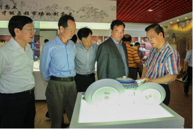 文化长城集团董事长蔡廷祥(右一)向漳州市委书记陈家东(右二)、漳州市长檀云坤(右三)、潮州市委书记李水华(左二)、潮州市长卢淳杰(左一)介绍长城陶瓷