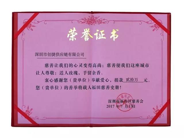 7月17日下午,由福田区经济促进局发起的2017年 “扶贫济困日”捐款企业座谈会在区机关大楼正式召开,会议通报了“扶贫济困日”捐款情况。深圳市创捷供应链有限公司在此次活动中捐款20万元,以自身的实际行动践行社会责任和关爱社会弱势群体,获得了福田区副区长刘智勇颁发的“对口帮扶,大爱无疆”奖牌。回馈社会是每一个企业应该承担的社会责任,这块奖牌也是政府对创捷供应链一直坚持华体会电子直播的高度认可。