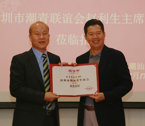 会议结束后,双方互赠纪念品。李奕标会长代表深圳市潮汕青年商会向深圳市潮青联谊会主席赵利生、常务副主席黄育存颁发名誉会长聘书。