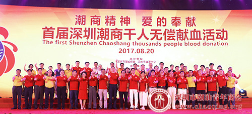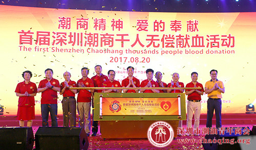 2017年8月20日,由深圳市潮汕商会、深圳市血液中心联合主办,深圳市潮汕青年商会等17家潮属社团协办的“潮商精神 爱的奉献——首届深圳潮商千人无偿献血活动”在会展中心举行。当天,深圳市血液中心调集市内三家血站的11辆采血车和60多名工作者参加采血工作,来自深圳市潮汕商会和各协办单位的潮商企业家、所属企业员工、家属和亲友共1000多人参加献血,成为深圳无偿献血史上一个新的里程碑。