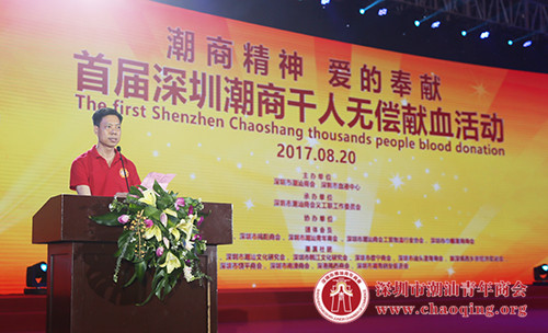 上午9时,活动启动仪式在会展中心5号馆隆重举行。深圳市委原副书记、深圳市商业联合会会长庄礼祥、深圳市委原常委、警备区司令员李友烈、深圳市政协原副主席余晖鸿等潮籍老领导,深圳市红十字会专职副会长兼秘书长赵丽珍,深圳市委卫生工委专职副书记、委党组成员廖澍华,市血液中心主任朱为刚、党总支书记卢亮,深圳市潮汕商会会长吴木棠、驻会会长黄育宏,深圳市潮汕青年商会会长李奕标,深圳市潮汕文化研究会主席黄惠生,深圳市汕头澄海商会会长朱英顺,深圳市饶平商会会长刘海景,深圳市南澳商会会长柯颖锋,巾帼潮商商会常务副主席魏銮英,深圳市潮汕商会监事长吴振城、党委书记邓东、常务副会长方武权、李奕标、谢学源、佘桂锡、卢德厚、林强有、李锐源、钟美财、张俊龙、副会长兼秘书长黄梓琪、副监事长姚欣强、黄耀光,宝安区中心血站站长刘晋洪、副站长陈昕,龙岗血站站长魏安业、副站长容莹、书记温秀明等领导嘉宾和献血者等共1000多人出席活动启动仪式。2017年8月20日,由深圳市潮汕商会、深圳市血液中心联合主办,深圳市潮汕青年商会等17家潮属社团协办的“潮商精神 爱的奉献——首届深圳潮商千人无偿献血活动”在会展中心举行。当天,深圳市血液中心调集市内三家血站的11辆采血车和60多名工作者参加采血工作,来自深圳市潮汕商会和各协办单位的潮商企业家、所属企业员工、家属和亲友共1000多人参加献血,成为深圳无偿献血史上一个新的里程碑。
