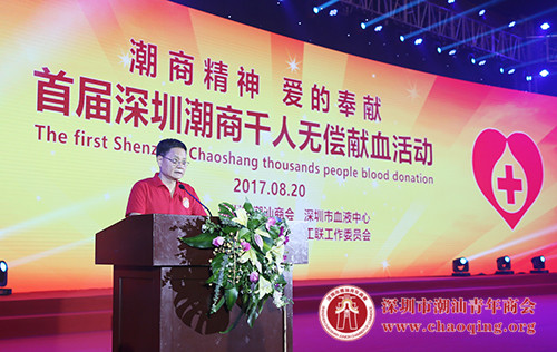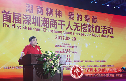 深圳市血液中心主任朱为刚代表血液中心对主办方深圳市潮汕商会以及参加今天活动的领导、潮汕乡亲表示中心感谢。他表示,本次活动将成为有史以来由商团组织的最大型的同乡献血活动,也将创造深圳单日献血记录。他表示,30多年来,无偿献血已成为深圳精神文明建设中的一面善良旗帜。在众多来深建设者中,潮汕乡亲是一支非常重要的力量,不仅为推动深圳经济发展做出重要贡献,同时热心公益,扶贫济困,为深圳精神文明建设做出突出贡献。他说,在这次大型公益活动中,深圳市潮汕商会的高度重视、精心策划、周密安排,众多潮属社团积极响应,光大潮籍乡亲踊跃报名,使我们再次看到了潮商精神和潮商力量的伟大。