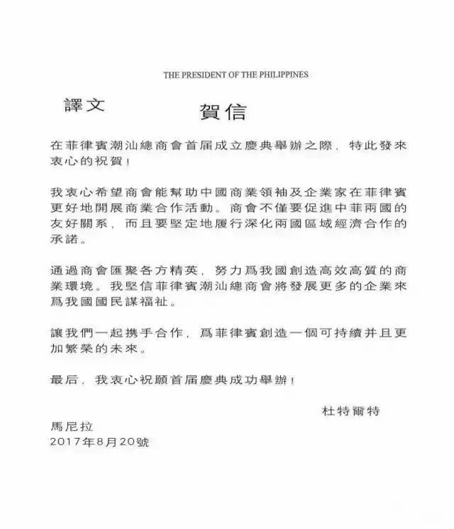 菲律宾总统杜特尔特先生向菲律宾潮汕总商会发来贺信