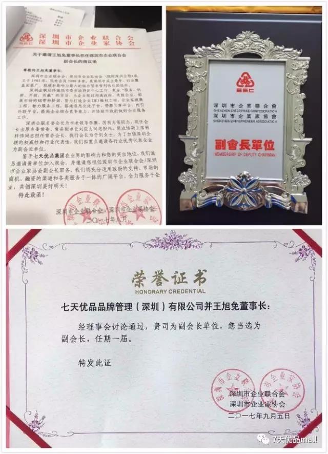 9月6日,深圳市企业联合会/深圳市企业家协会(以下简称为深圳市企业家协会)常务副秘书长陈小华正式授予七天优品“深圳市企业联合会副会长单位”牌匾,七天优品集团董事长王旭免先生当选为深圳市企业家协会副会长,七天优品在业界的影响力进一步得到肯定。