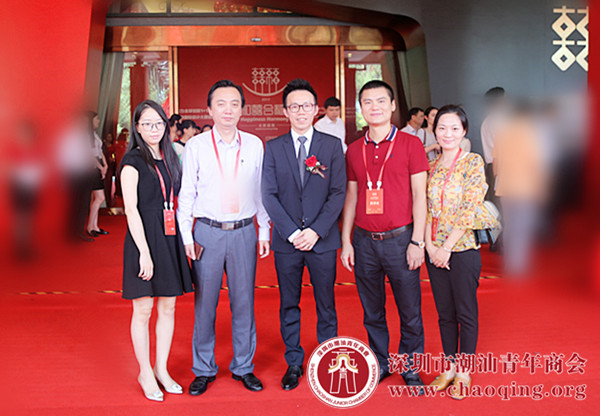 百泰集团董事长、深圳市潮汕青年商会常务副会长周灿坤与深圳市潮汕青年商会秘书长黄坚泰,常务副会长张镇江,会长助理郑娟、黄文琦合影