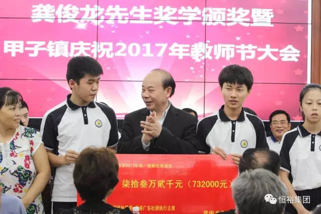 此外,龚俊龙先生也一直关心着甲中学子的成长,2016年开始设立“龚俊龙先生奖学金”,对甲子中学高一新生中考成绩优异者给予奖励,2016年共奖励28.7万元,2017年的奖学金增至73.2万元, 让更多优异学子可以通过自身的努力,给家庭减轻一定的经济压力,也为甲子中学营造了浓厚的学习氛围,这必将为甲子中学,乃至甲子镇的教育赢得更宝贵的上升空间。