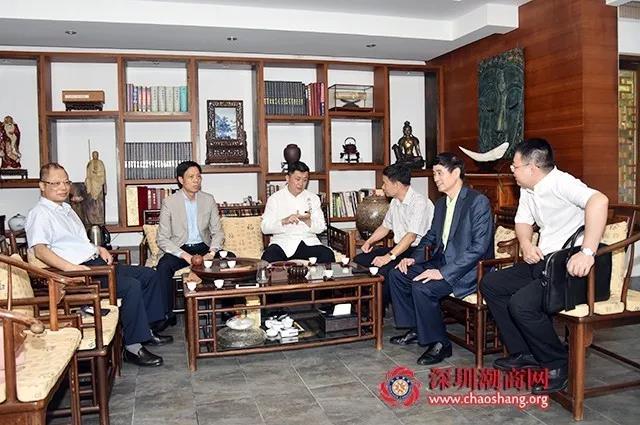 2017年10月14日上午,深圳市潮汕商会会长吴木棠、荣誉会长王再兴、驻会会长黄育宏、常委、副会长何奕鹏、财金委副主席蔡辉洪一行赴潮州,拜访了正大集团副总裁、砚峰书院院长、本会名誉会长李闻海,受到热情接待。