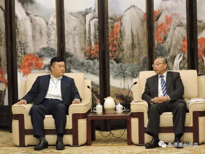 香港潮州商会会长胡剑江与中华全国工商业联合会副主席、上海市政协副主席、上海市工商业联合会主席王志雄(右)会谈。