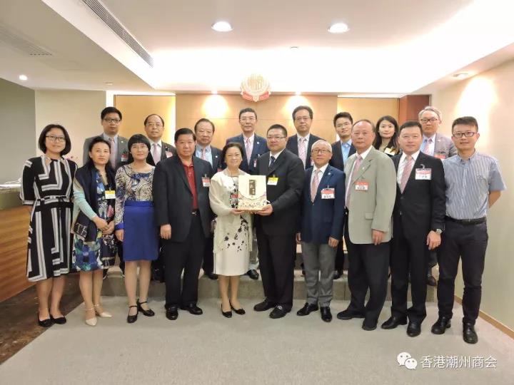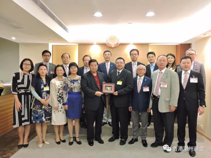 香港潮州商会黄书锐副会长(前排中)向国侨办经济科技司夏付东副司长致送纪念品