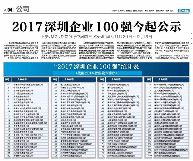 百泰集团、奇信股份荣登“2017年深圳企业100强”公示榜单
