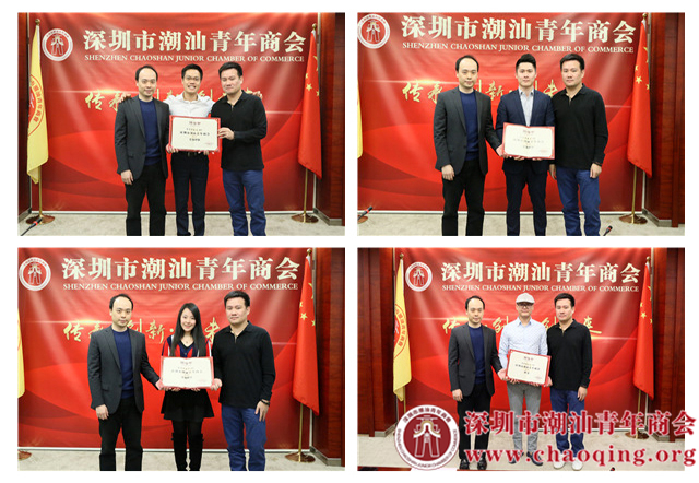 轮值执行会长龚海鹏、吴泽锐分别为常务理事许卓彬(上左)、吴晓鹏(上右)、黄诗琪(下左)、理事李树城(下右)授牌