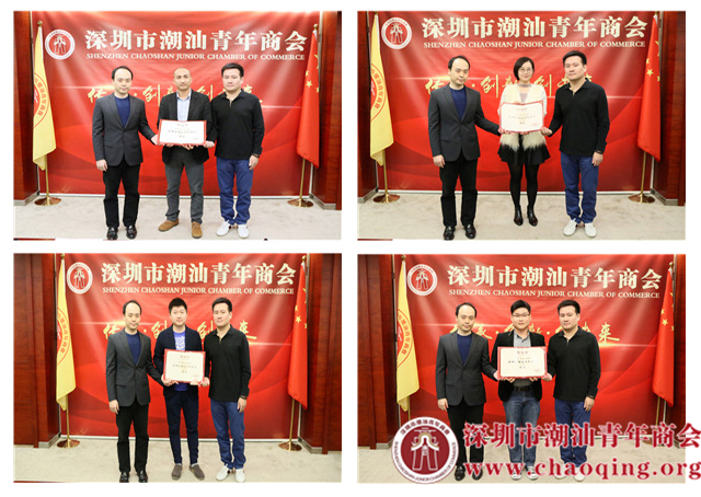 轮值执行会长龚海鹏、吴泽锐分别为理事苏斌斌(上左)、杜超(上右)、罗晓红(下左)、何晓丹(下右)授牌