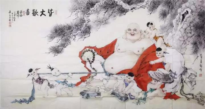 管老先生表示,《皆大欢喜》和《慈怀天下,笑对人生》的取材都是可亲可爱的弥勒佛,他在创作过程中没有像传统的创作家一般倾向于将弥勒佛的整体风格形象佛化、庄严化,而是立足于社会实际,融入了生活中的一些人性化的元素,例如特意将弥勒佛的脸部揉入了婴孩的面部特征、在背景构图方面加入一些能烘托画作精神的元素(调皮玩耍的小孩)等等,使得弥勒佛的整体形象更加亲切祥和、人见人爱,更贴切地传达出了祥和欢乐、大肚能容的艺术气息。