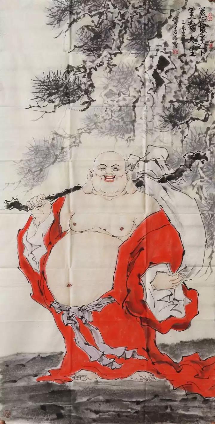 有这么多领导和爱心人士的支持,拍卖会现场上那些热心公益的爱心买家也热情高涨,竞价此起彼伏。其中,最为引人注目的竞拍作品是由国家一级舞台美术设计师兼广东潮剧院名誉院长管善裕老先生创作的两幅弥勒佛画作——《皆大欢喜》和《慈怀天下,笑对人生》。