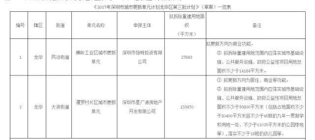 12月8日,龙华政府在线发布关于《2017年深圳市城市更新单元计划龙华区第三批计划》(草案)公示。信息显示,共有2个项目纳入计划,拟拆除重建用地面积16万平。