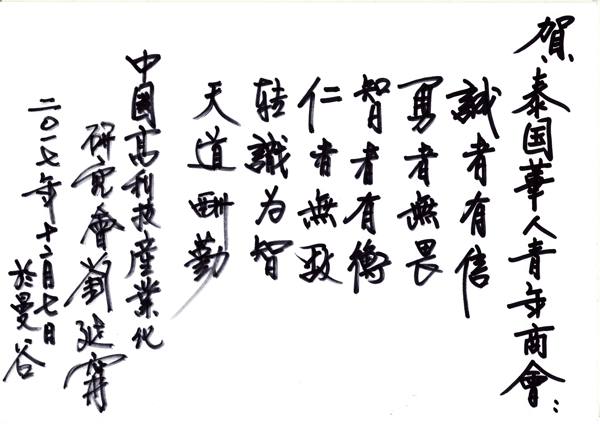 随后,聂向东执行董事、杨栋副主任、洪文平副主任、李大心主任、宋彩虹副主任、张成良董事长等科技专家与企业家高度肯定了泰国华人青年商会多年来为祖国和中泰两国所做出的突出贡献。大家共同表示,此次座谈会是一次充满爱国主义情怀、友情溢满心底,具有深远意义的交流、座谈会,未来一定能够达成中泰两国多领域、各方位的成功合作。座谈后,刘延宁副理事长为泰国华人青年商会挥毫赐墨宝题贺:泰国华人青年商会——诚者有信、勇者无畏、智者有衡、仁者无敌、转识为智、天道酬勤。