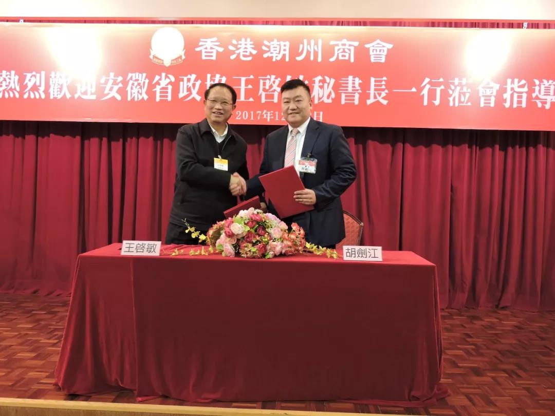 随后,胡剑江会长、王啓敏秘书长分别代表香港潮州商会和安徽省政协签订合作协议,未来将进一步发挥香港工商界人士在国家经济发展中的独特优势,支持安徽经济发展,推动皖港两地交流合作迈向新的里程碑。