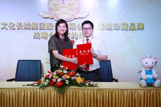 2015年7月27日,广东文化长城集团股份有限公司与天络行(上海)品牌管理有限公司在长城集团艺术馆隆重举行“泰迪珍藏”品牌合作签约仪式,成为“泰迪珍藏”中国区特约生产、销售授权商。长城集团副董事长吴淡珠女士、天络行(上海)品牌管理有限公司总裁张丽华女士及长城一众高管均出席了签约仪式,共同见证这一重要时刻。