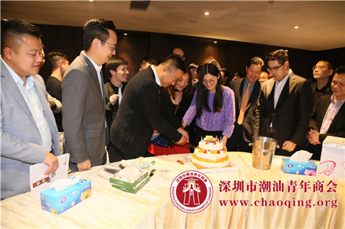 现场的会员们齐唱生日快乐歌,切开生日蛋糕,现场气氛热烈,一片欢声笑语,大家高呼“潮青,潮青,未来之星”和“潮青,潮青,永远年轻”的口号,将晚会推向高潮。李奕标会长还为各位寿星送上特制生日礼物。