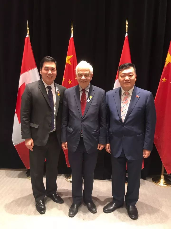胡剑江会长同加拿大国会议员陈圣源(左)、加拿大驻华大使麦家廉(中)合影留念。