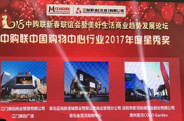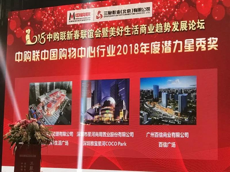 2018年1月17日,在中购联购物中心发展委员会主办的“中购联2018新春联谊会暨美好生活商业趋势发展论坛”活动中,星河商置运营管理的代表项目惠州星河COCO Garden、深圳星河WORLD•COCO Park分获 “中购联中国购物中心行业2017年度星秀奖”、“中购联中国购物中心行业2018年度潜力星秀奖”!